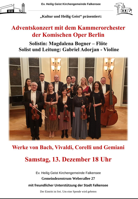 Gemeindezentrum Heilig Geist Weberallee 27, FalkenseeWerke von Bach, Vivaldi, Corelli und Gemiani Solistin: Magdalena Bogner - Flöte Solist und Leitung: Gabriel Adorjan - Violine